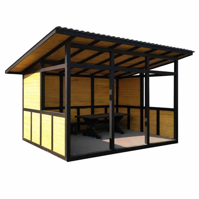 Sjenica od metala i drveta idealna je za privatna dvorišta, vikendice, bašte i seoska domaćinstva. Može se koristiti kao letnja trpezarija, prostor za odmor ili zaklon tokom lošijeg vremena.