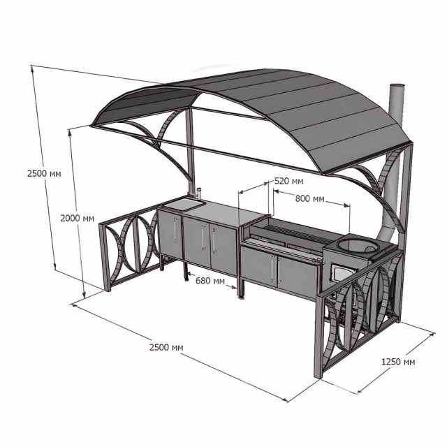 Metalna konstrukcija mangal zone izrađena je od čeličnih profila koji obezbeđuju stabilnost, otpornost na visoke temperature i dug vek trajanja. Nadstrešnica štiti radni prostor od kiše, snega i sunca, omogućavajući korišćenje mangala u svim vremenskim uslovima.